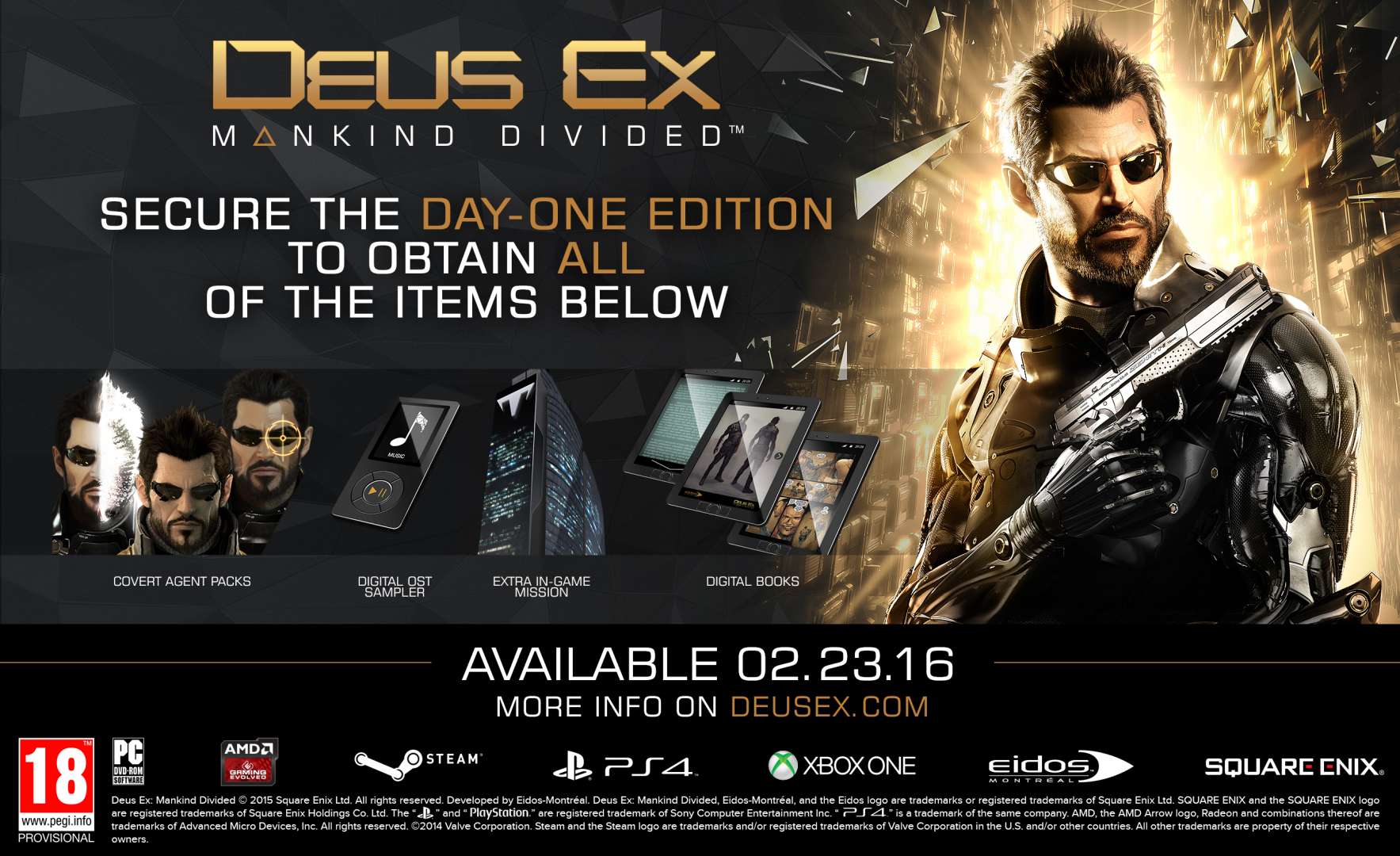 Square Enix en Eidos-Montréal maken bekend dat het ‘Augment Your Pre-Order’-programma voor Deus Ex: Mankind Divided wordt aangepast om beter te voldoen aan de verwachtingen van de Deus Ex-community. De promotie was oorspronkelijk bedoeld als beloning voor spelers die hiermee hun eigen content konden kiezen (aansluitend op een van de belangrijkste gameplay-aspecten van Deus Ex), maar werd door de community negatief ontvangen. Square Enix en Eidos-Montréal hebben de feedback gezien, gehoord en gelezen, waarna ze besloten het programma te veranderen en het ‘tiers’-systeem voor pre-orders te annuleren.