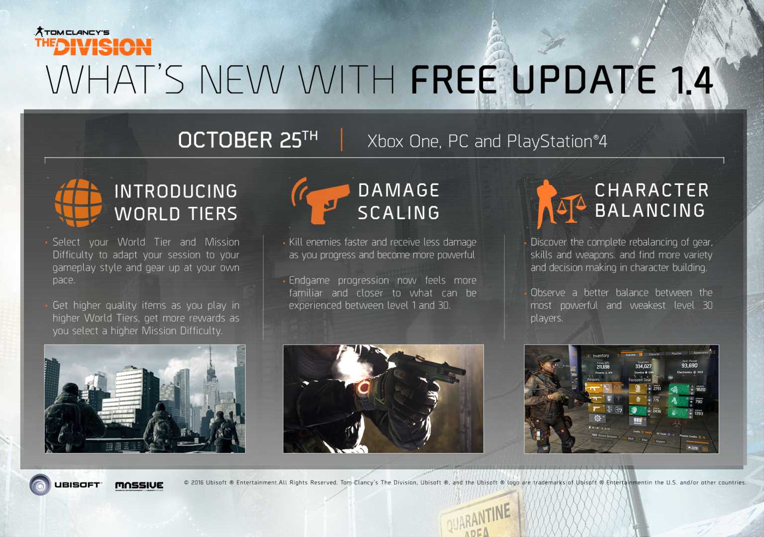 De gratis Update 1.4 voor The Division is nu beschikbaar voor Xbox One, PC en PlayStation 4. Samen met de community zijn er stappen gezet om de end-game ervaring van Tom Clancy’s The Division interessanter, en vooral, leuker te maken.