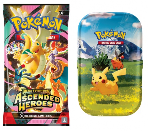 - Mega Evolution—Ascended Heroes Mini Tin: Bevat twee Mega Evolution—Ascended Heroes booster packs, een art kaart en een stickerkaart die bij het ontwerp van het blikje past.