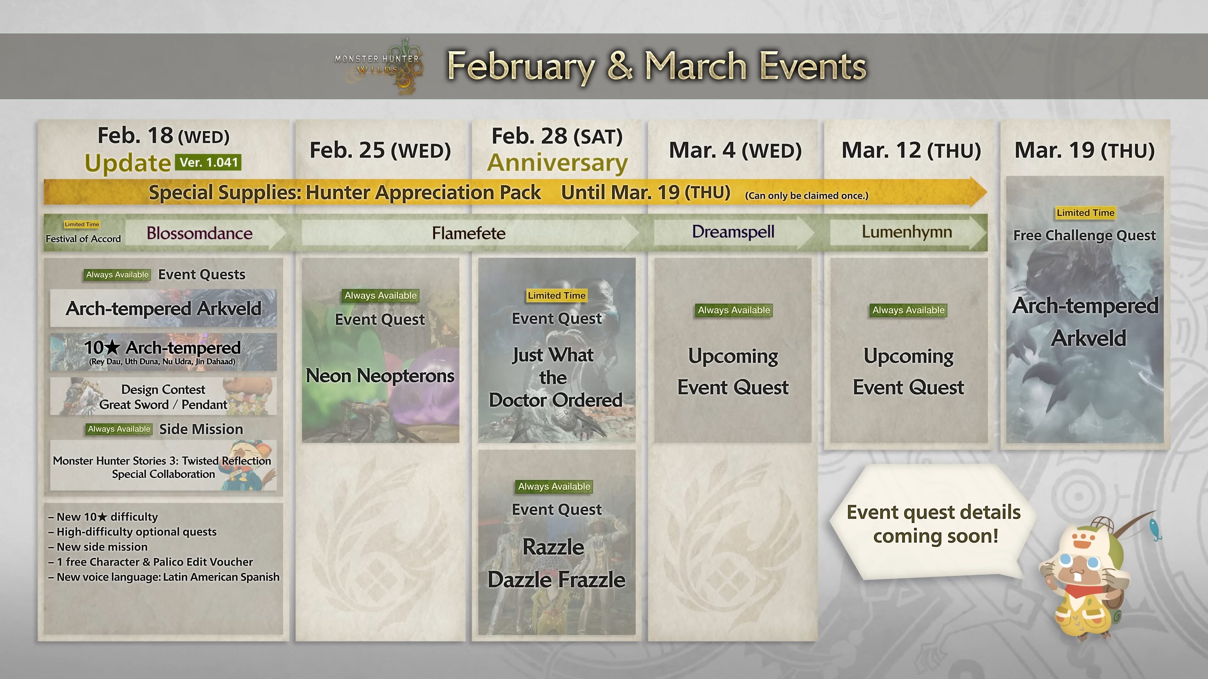 Update 1.041 brengt diverse vernieuwingen, waaronder nieuwe missies en een samenwerkingsevenement met Monster Hunter Stories 3: Twisted Reflection. En dit is zeker niet het enige waar we naar uit mogen kijken, getuige onderstaand overzicht: