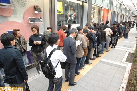 Hieronder zie je enkele foto's van mensen die staan aan te schuiven voor Monster Hunter Freedom 2G.