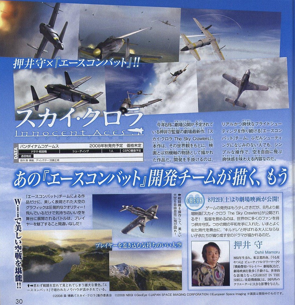 Namco Bandai scoort reeds jaren met de Ace Combat serie. Momenteel probeert het Ace Combat team een nieuwe Flight Simulation te ontwikkelen, namelijk The Sky Crawlers voor de Wii. De game is gebaseerd op de gelijknamige manga. Je moet op de scans klikken om ze op volledige resolutie te kunnen bekijken.