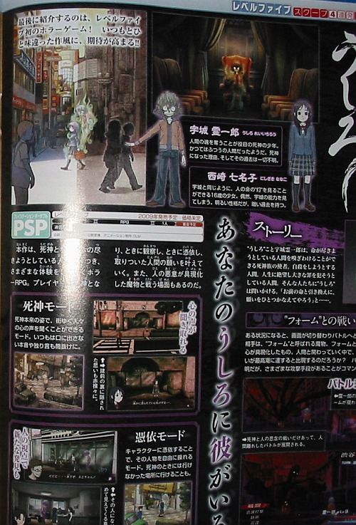 Eén van die spellen is Ushiro, een RPG met een duidelijk horrorthema. In de game speel je een shinigami waarbij de shinigami zich verbindt aan stervelingen om hun laatste wens te vervullen. De shinigami moet ook vechten tegen een monster dat het kwaad van de persoon voorstelt.