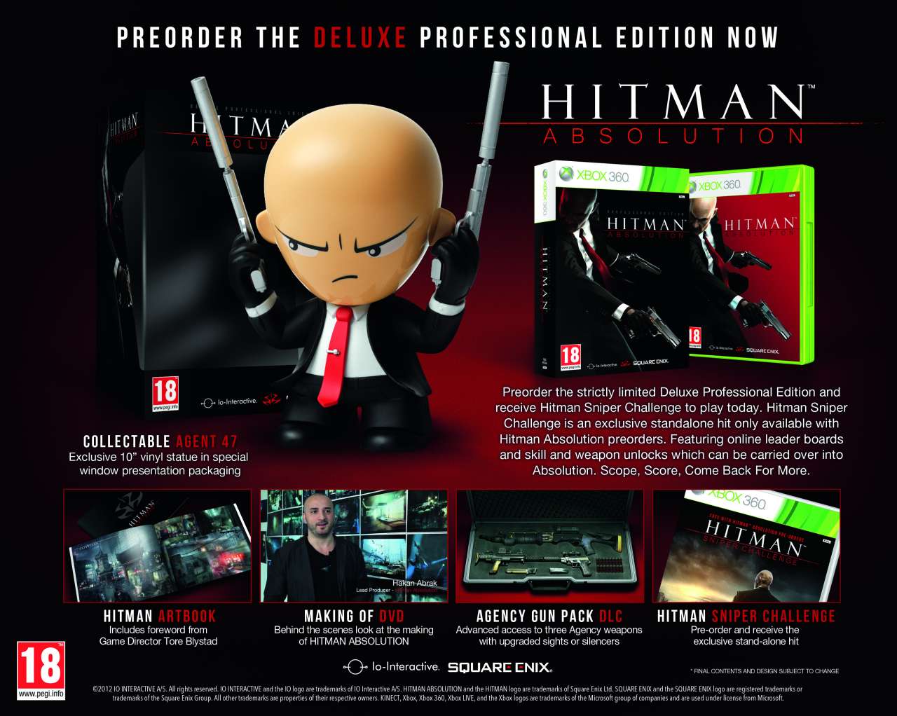 Naast de game krijgt je in deze editie een 10" Agent 47 vinyl beeldje, een artbook met hardcover, een making of DVD en de Agency Gun-Pack DLC die tevens in de normale Professional Edition te vinden is. Ook hier geeft een pre-order je toegang tot de Sniper Challenge, waar we eerder al een recensie over schreven.