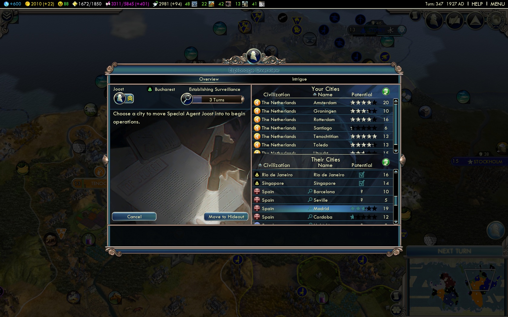 Wanneer je de Renaissance bereikt hebt is de invloed van religies afgenomen: missionarissen kosten op dat moment vrij veel Faith en de diplomatiekinvloed is nog klein. Op dat moment komt spionage ervoor in de plaats. Wanneer de eerste civilization de Renaissance bereikt krijgt iedere speler een spion tot zijn beschikking. Dit aantal neemt in latere tijdperken toe. Deze spionnen verschijnen niet als eenheden op de kaart, maar zijn aan te sturen via een menu. Globaal kan je ze gebruiken voor drie verschillende acties. In de eerste plaats kan je ze naar stadstaten sturen. Hier bewerken ze de verkiezingen om je invloed te doen stijgen. Als je ze naar de stad van een andere civilization stuurt houden ze een oogje op de vijand en stelen ze technologieën. Om de zoveel tijd wordt je ingelicht over de plannen. Een spion in Madrid kan je bijvoorbeeld na een tijdje berichten dat Spanje op het punt staat om Washington aan te vallen. Stap vervolgens op Washington af en je krijgt de optie hem hierover te vertellen, zodat je relatie met hem verbetert. Verdedigen tegen vijandige spionnen doe je door je eigen spionnen in je steden te laten werken of door enkele van de nieuwe gebouwen te plaatsen.